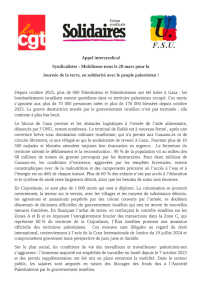 7. Appel intersyndical Syndicalistes : Mobilisons-nous le 28 mars pour la Journée de la terre, en solidarité avec le peuple palestinien ! Commentaires fermés sur Appel intersyndical Syndicalistes : Mobilisons-nous le 28 mars pour la Journée de la terre, en solidarité avec le peuple palestinien !